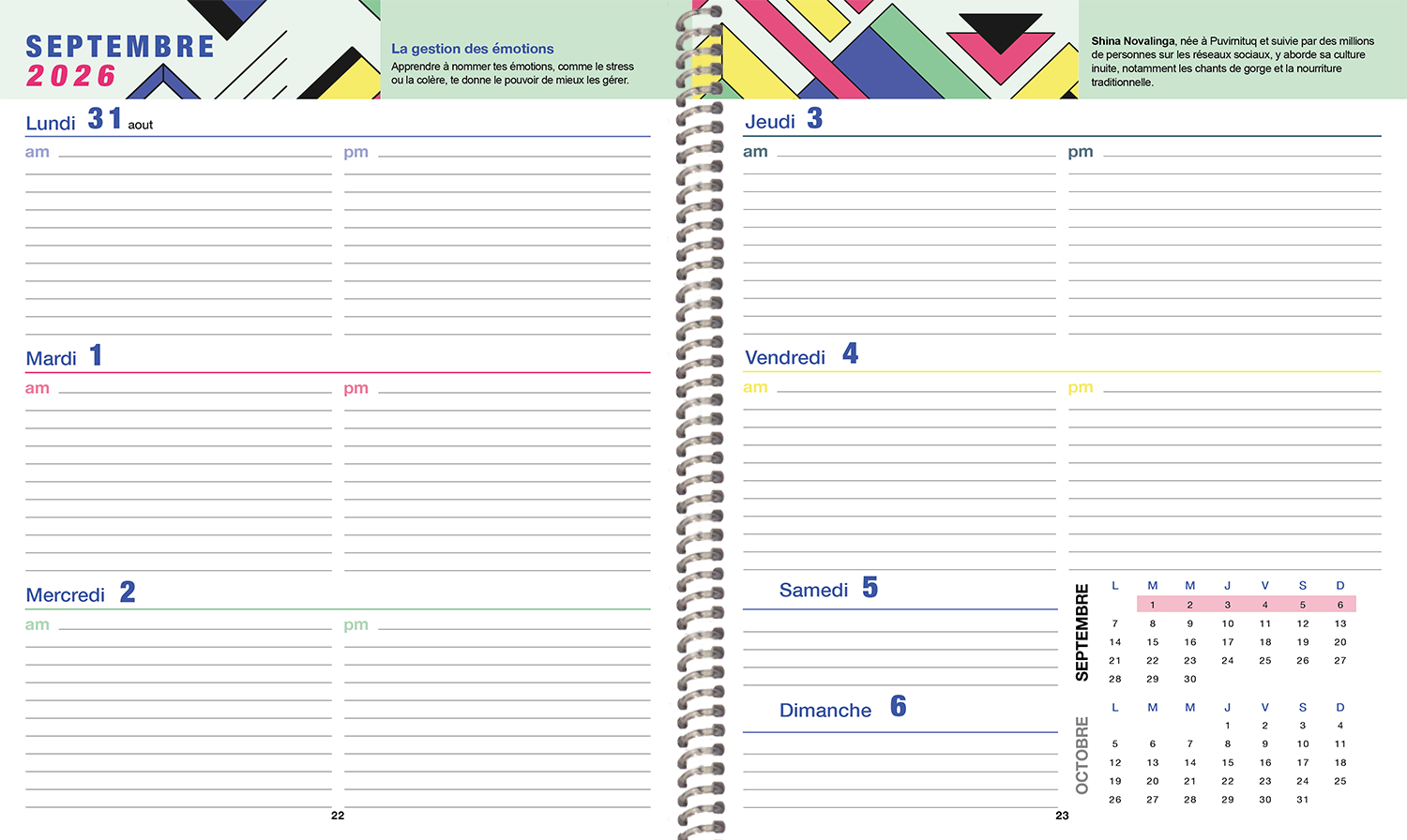 Semainier (7 x 8,5 po), 120 pages, du 3 aout 2026 au 27 juin 2027.