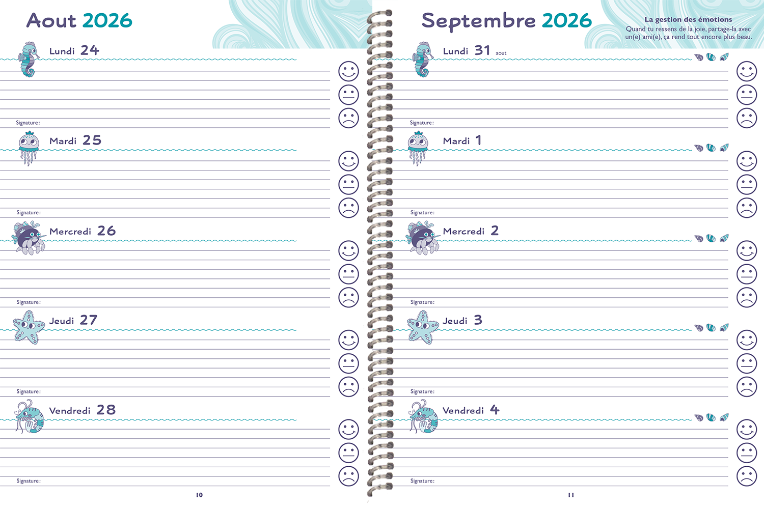 Grand semainier (8,5 po X 11 po), 80 pages, du 10 aout 2026 au 25 juin 2027.