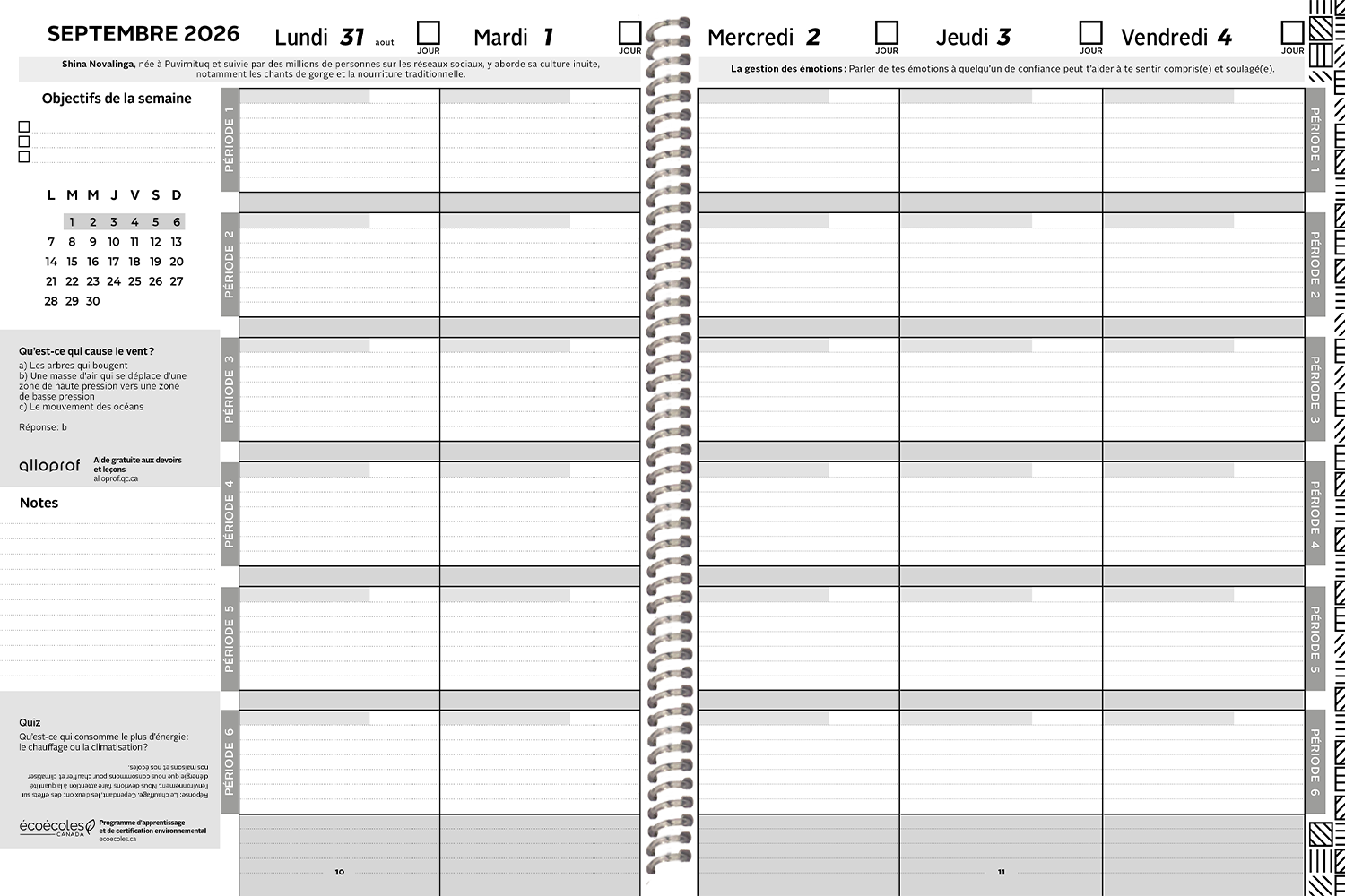Les contenus éducatifs disponibles pour tous nos agendas ont été minutieusement développés en collaboration avec Alloprof, ÉcoÉcoles Canada, Fondation jeunes en tête et TELUS Santé. Ensemble, nous promouvons de saines habitudes de vie et soutenons la réussite scolaire dans les écoles canadiennes.