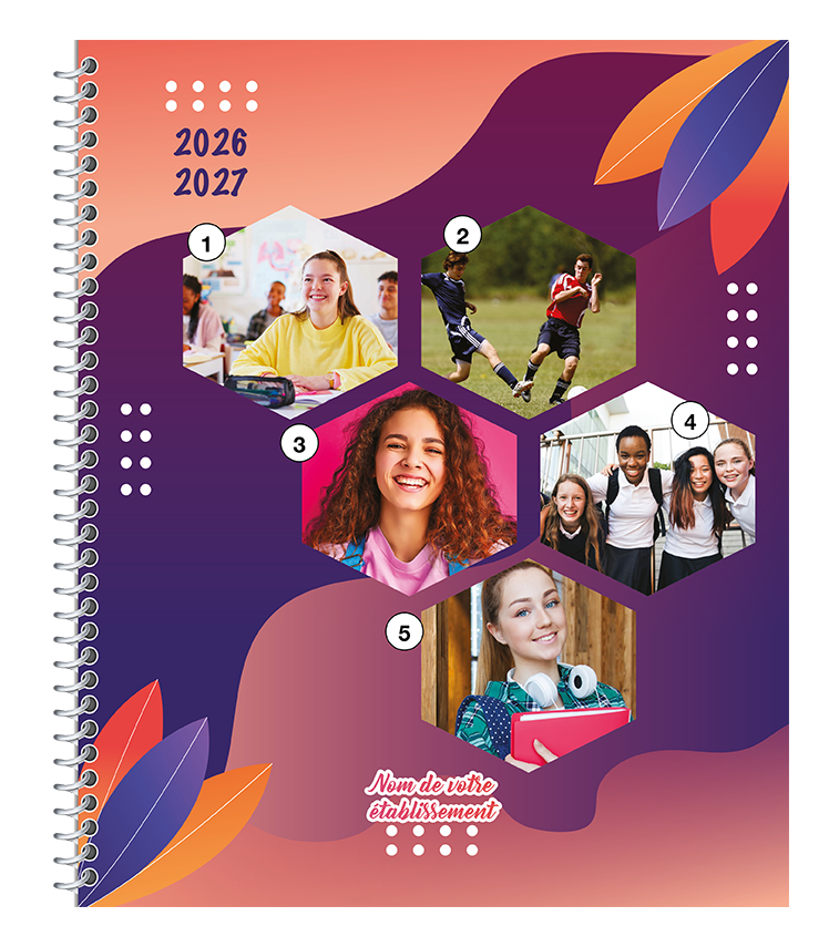 Conçu pour les écoles de 750 élèves et plus, l’agenda personnalisé permet d’intégrer des contenus distinctifs dans la grille du semainier, comme les jours cycles, le logo de l’école ou des informations sur les activités parascolaires. Notre catalogue propose une variété de grilles hebdomadaires, bordures, entêtes et couleurs pour créer un agenda sur mesure.