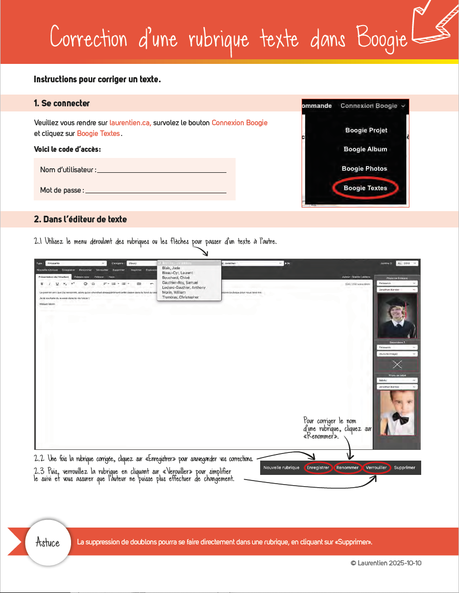 - Pour les arrivées tardives ou les départs pendant l’année scolaire, il est possible d’ajouter, de supprimer ou de déplacer des textes avec leur photos dans les pages sans avoir à recommencer toute la mise en page