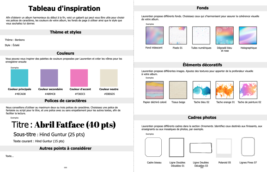 Personnellement, ce que je fais pour commencer, c’est construire un schéma visuel sur une feuille de papier ou à l’écran pour structurer mon album et voir à quoi il pourrait ressembler. On appelle ça un tableau d’inspiration. C’est cool, car Laurentien offre un outil de ce type qui se nomme « Tableau d’inspiration »; c’est super facile de travailler avec! Tu pourras le trouver dans les Gabarits Laurentien (Tableau d’inspiration).